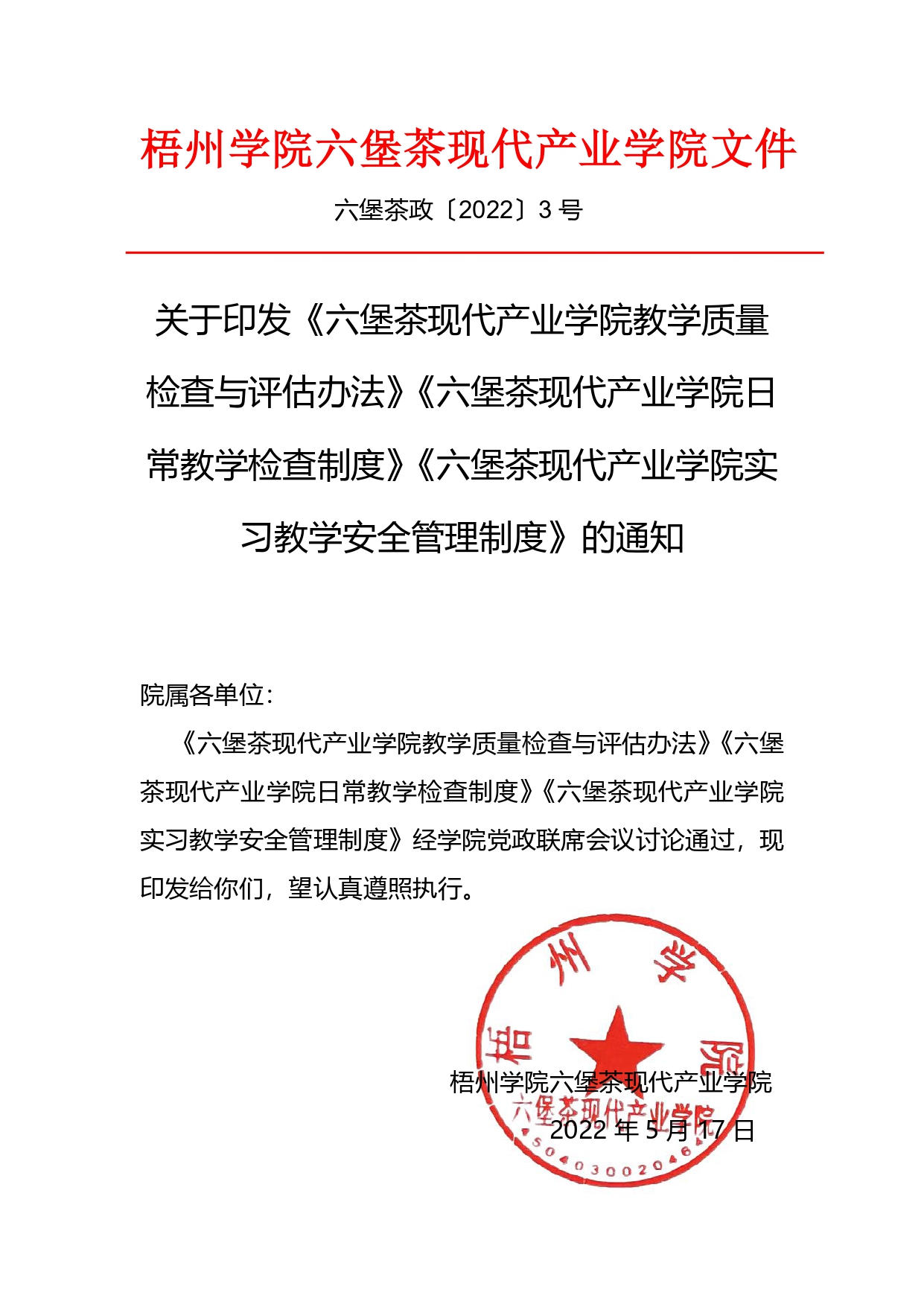 关于印发《六堡茶现代产业学院教学质量检查与评估办法》《六堡茶现代产业学院日常教学检查制度》《六堡茶现代产业学院实习教学安全管理制度》的通知