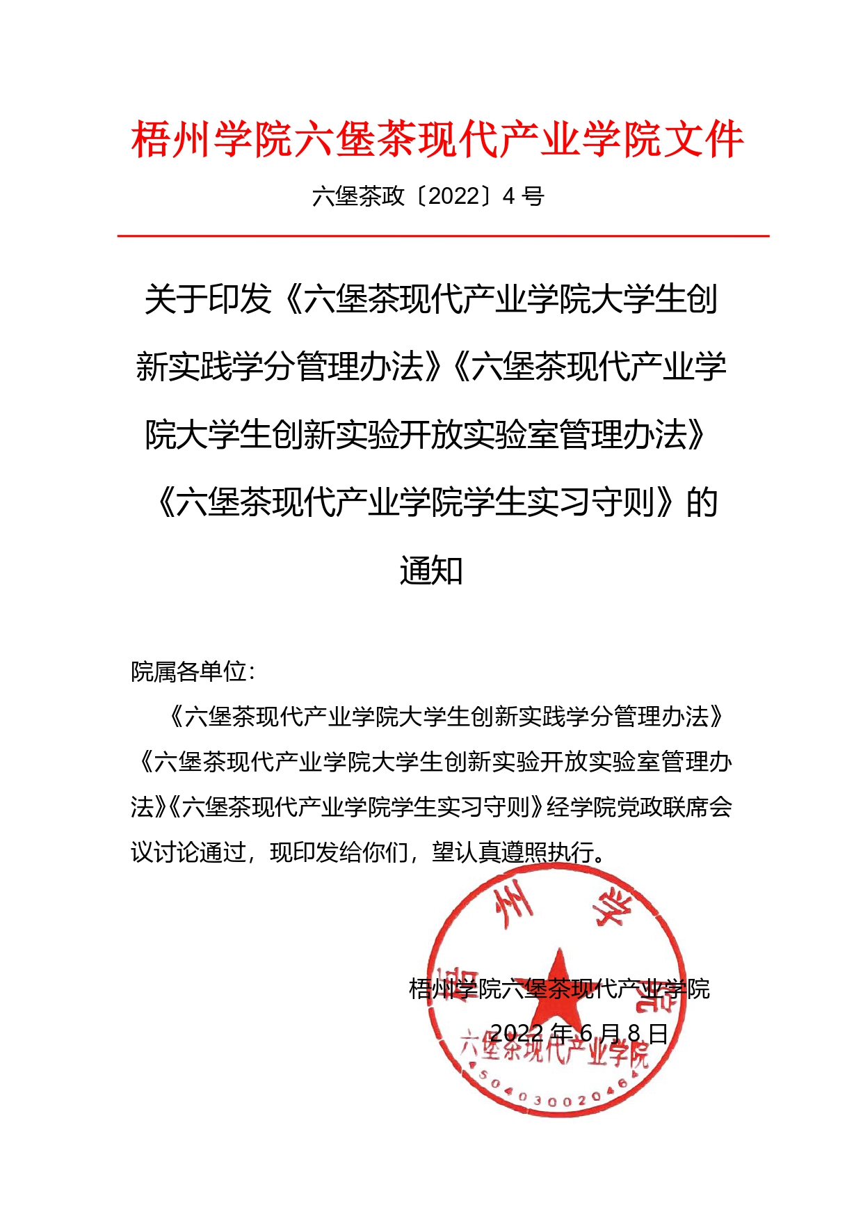 关于印发《六堡茶现代产业学院大学生创新实践学分管理办法》《六堡茶现代产业学院大学生创新实验开放实验室管理办法》《六堡茶现代产业学院学生实习守则》的通知